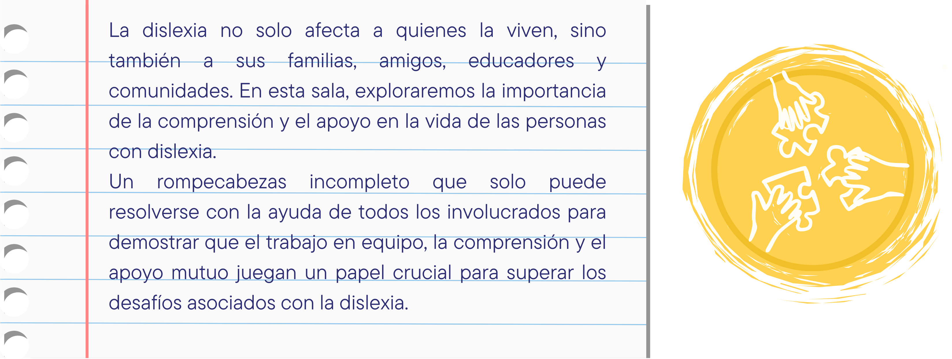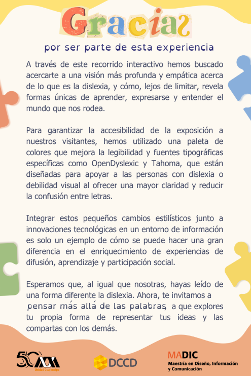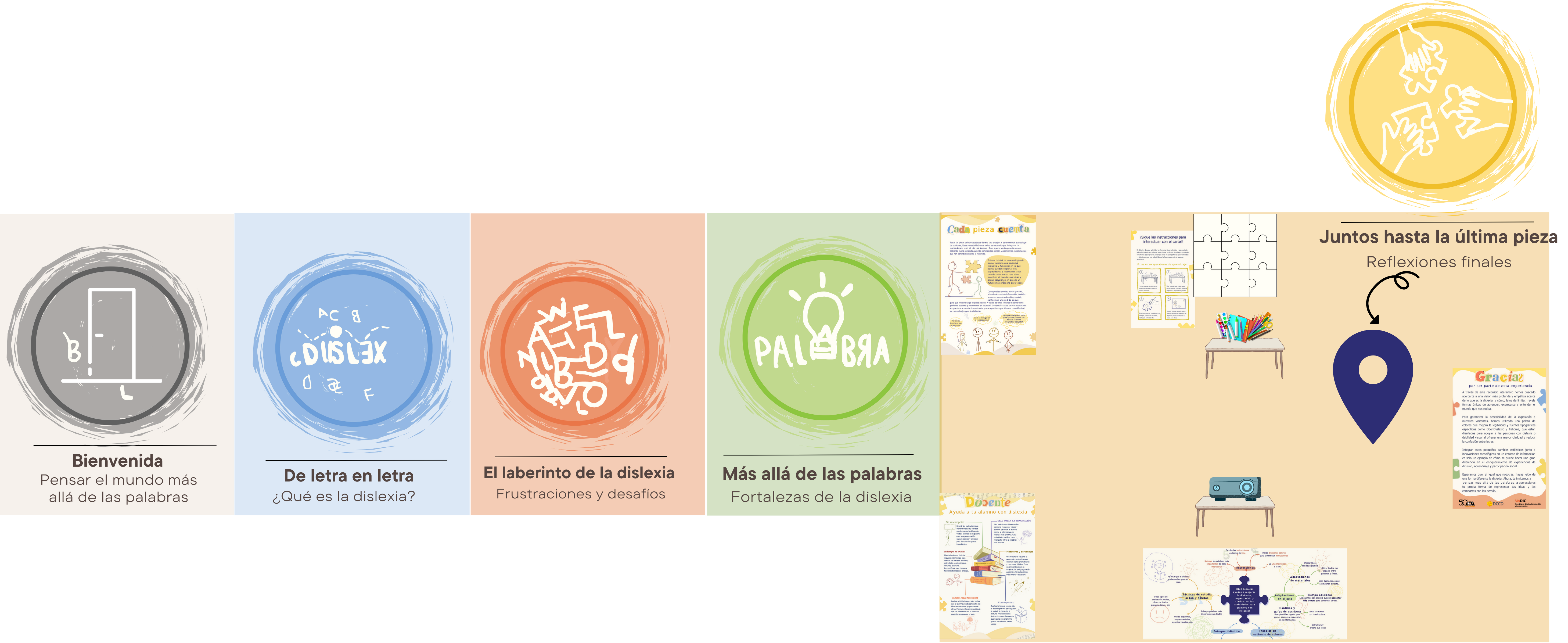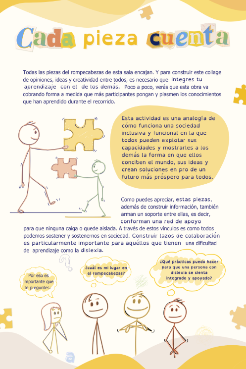 El material necesario para esta sala es el siguiente: cartel cada pieza cuenta, piezas de rompecabezas para la actividad colaborativa, instrucciones para la actividad del rompecabezas, cartel docente ayuda a tu alumno con dislexia, video para proyectar sobre técnicas en el salón de clases para estudiantes con dislexia, y cartel de cierre de la exposición. Si prefieres no interactuar con las aplicaciones, puedes realizar el recorrido de manera física con la ayuda de los carteles.